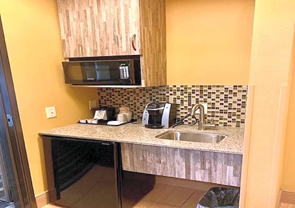 This room features a microwave, small refrigerator, and cable television. A sofa is also included.